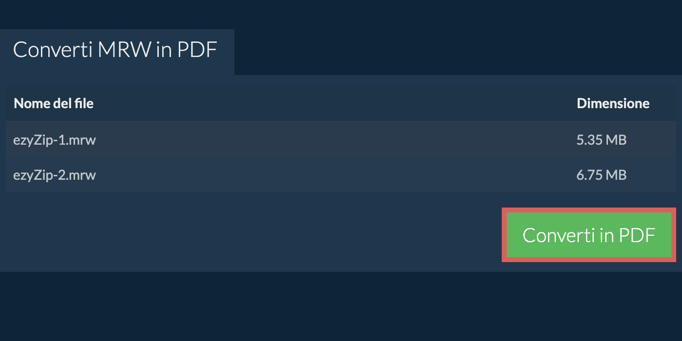 ezyZip è un insieme di utility per comprimere e convertire file, inclusa questa convertitore da MRW a PDF. Non è necessario installare software aggiuntivi. Supporta una miriade di altre opzioni di conversione di immagini anche.
