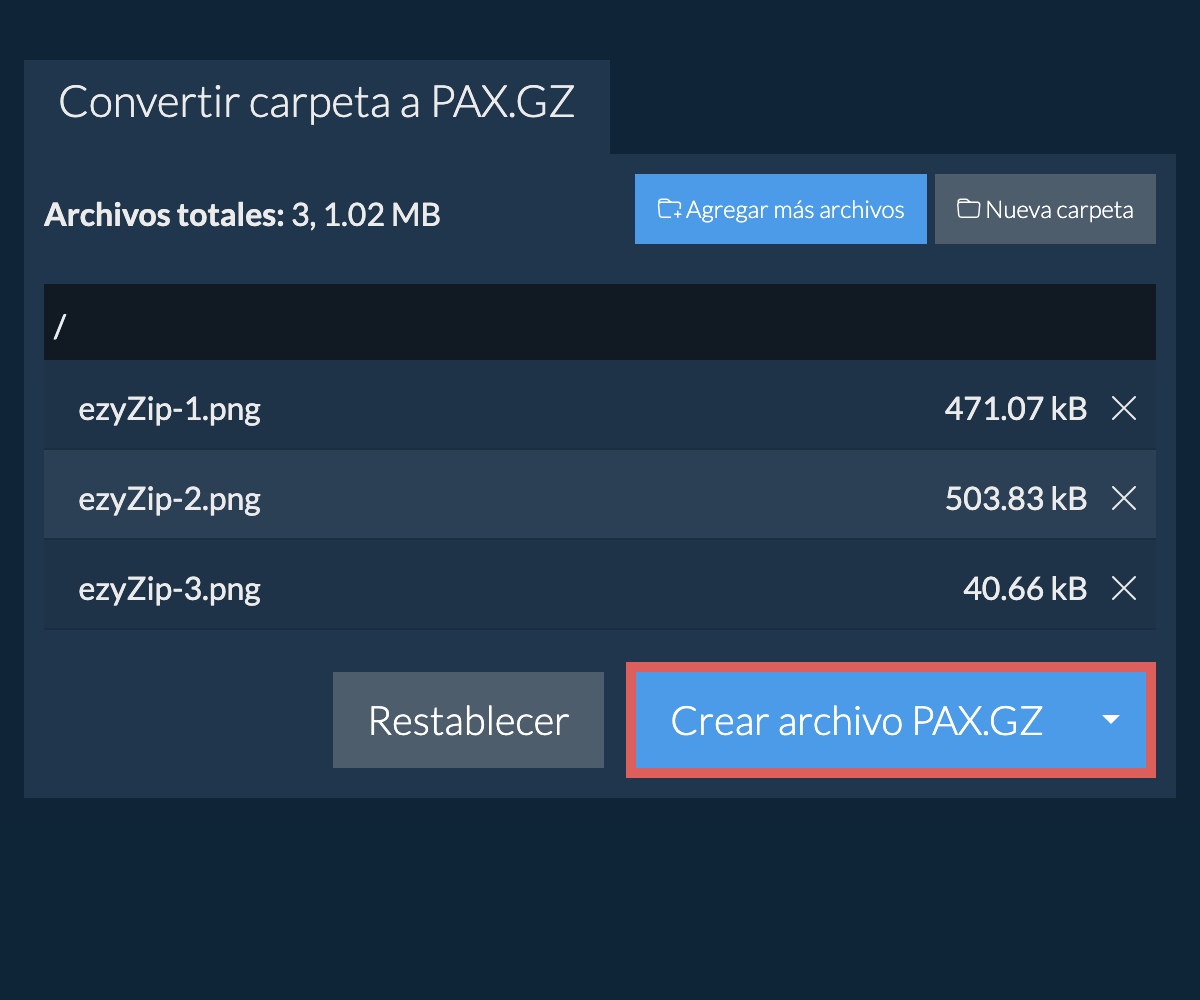 Una vez que se procesen todos los archivos, aparecerá el botón "Guardar archivo PAX.GZ".