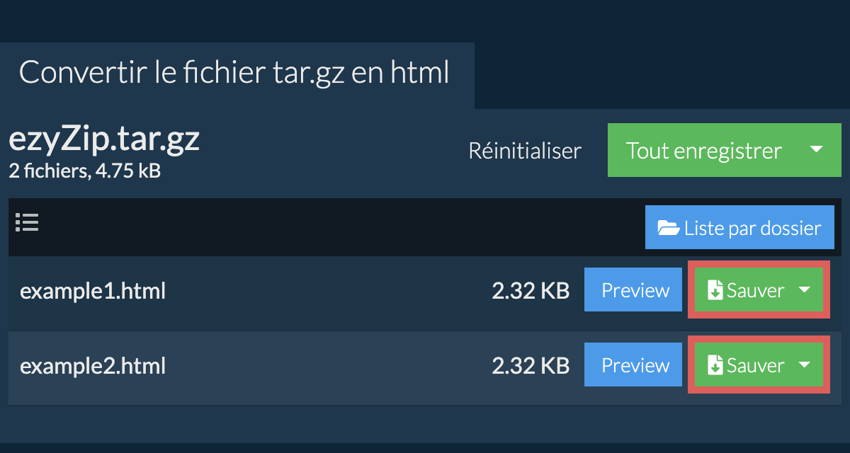 Voici les étapes pour convertir une archive TAR.GZ en fichier HTML en utilisant ezyZip.
