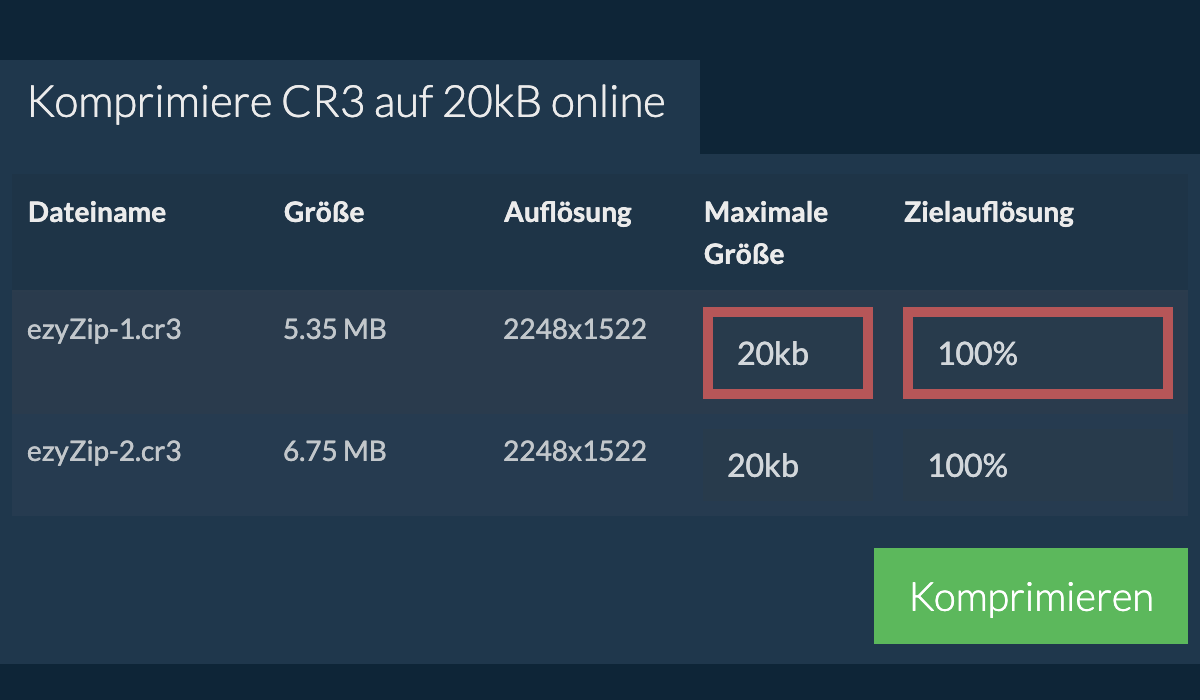 Schritt-für-Schritt-Anleitung, wie du CR3 online auf 20kB mit ezyZip komprimierst.