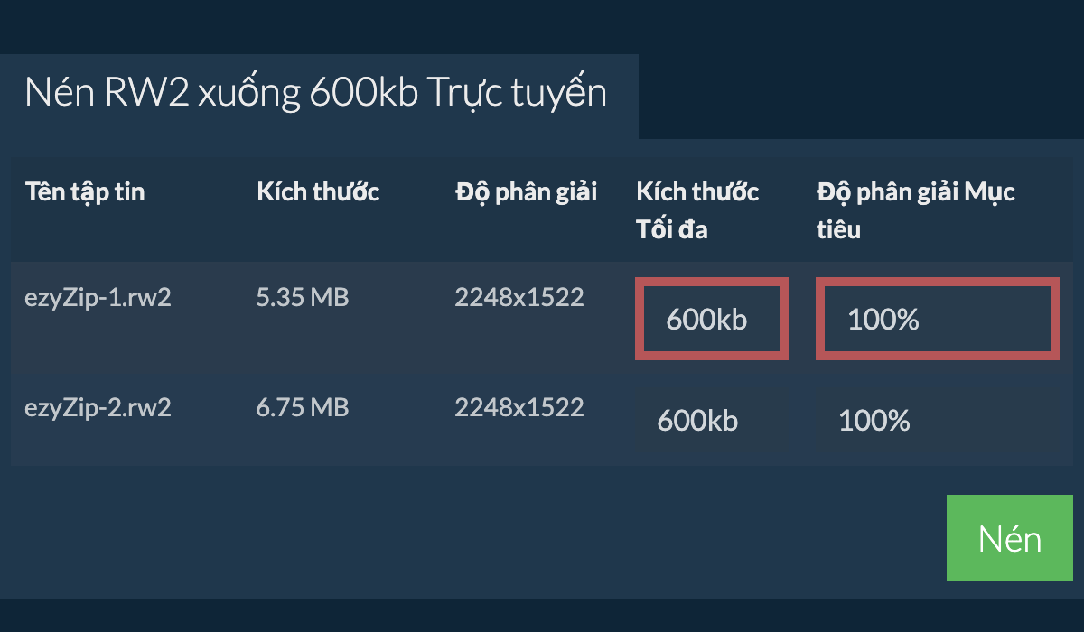 Nhấn vào nút "Nén" màu xanh lá cây ở phía dưới để bắt đầu quá trình nén.